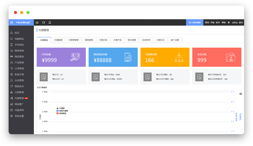 代理系统是由我司研发团队自主研发的一体化代理平台,发动代理商或朋友圈、移动端零售商发展三级以上代理商的全新系统,帮助企业打造多层级的营销模式,打破传统地域限制,不再按照固定佣金设置分成,下家可根据商家要求发展成上家代理,并快速复制其商业模式,结合多级裂变代理模式,吸引用户成为代理商为您销售商品,瞬间建立代理体系,抢占庞大线上市场。